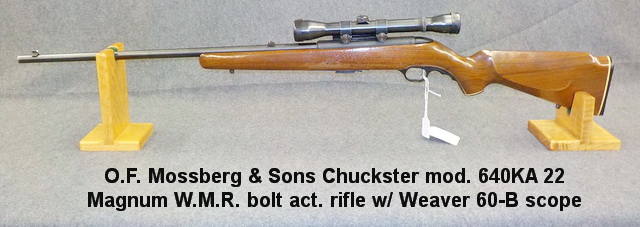 640KA 22 Magnum W.M.R. bolt act. rifle w/ Weaver 60-B scope, Mossberg mod. 500AT