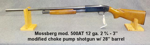 12 ga. 2 ¾ - 3” modified choke pump shotgun w/ 28” barrel, Mossberg mod. 500AG
