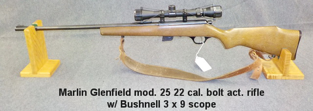 scope, Marlin Glenfield mod. 25 22 cal. bolt act. rifle w/ Bushnell 3 x 9 scope,