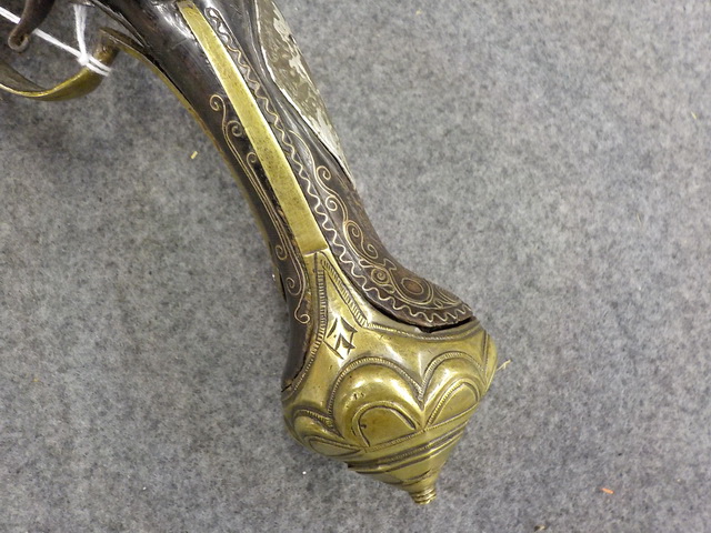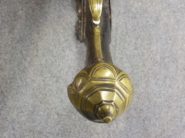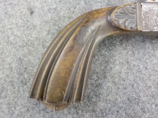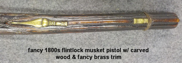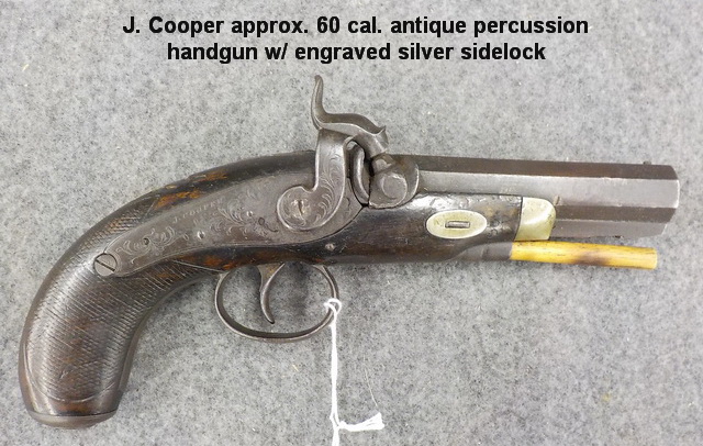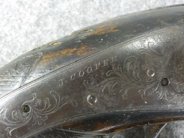 pistol w/ carved wood & fancy brass trim, J. Cooper approx. 60 cal. antique