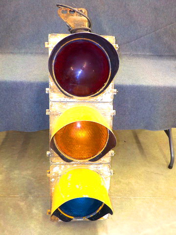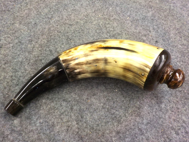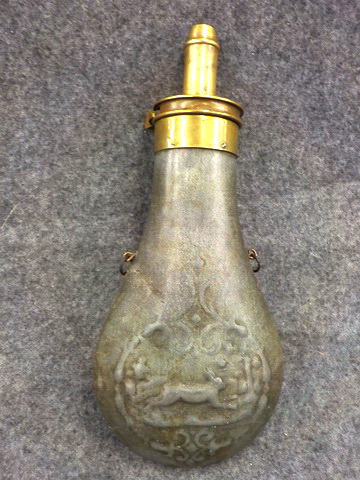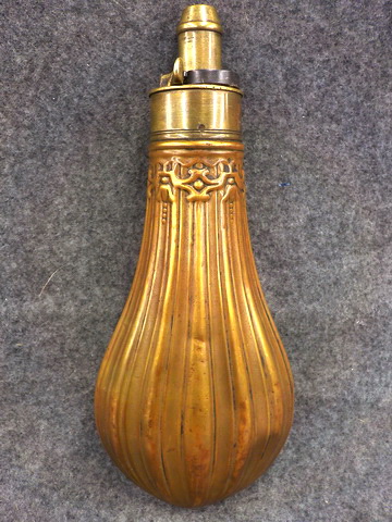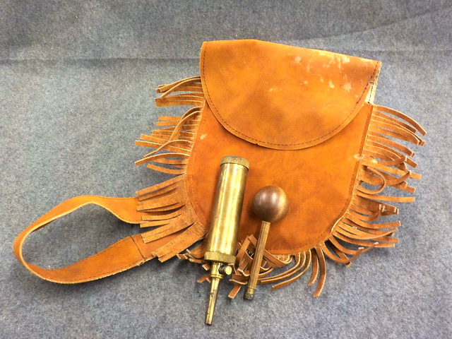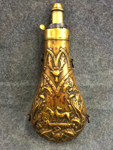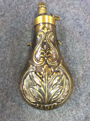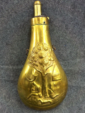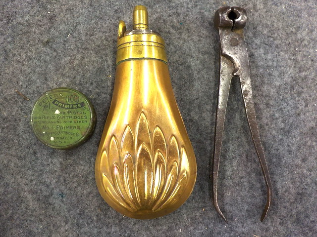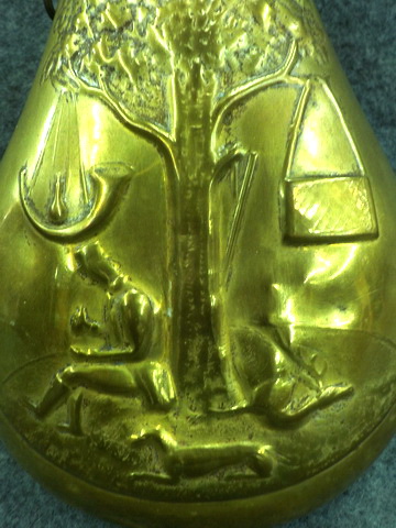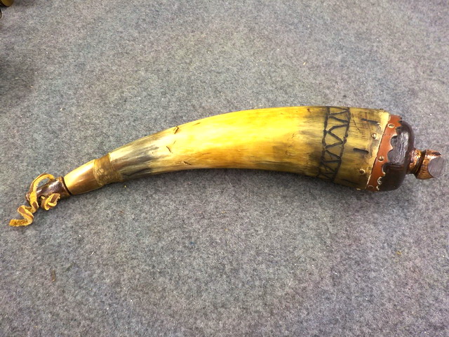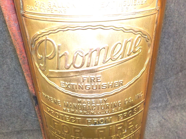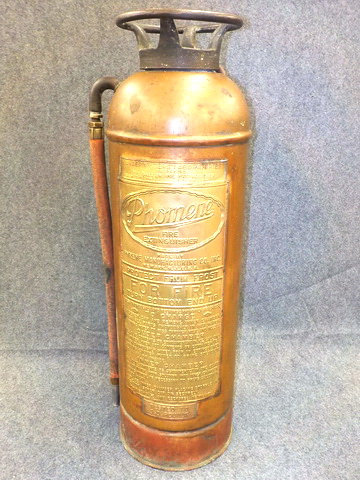 vintage powder horns, vintage large red light, copper & brass fire extinguisher,