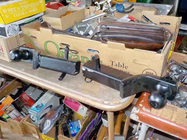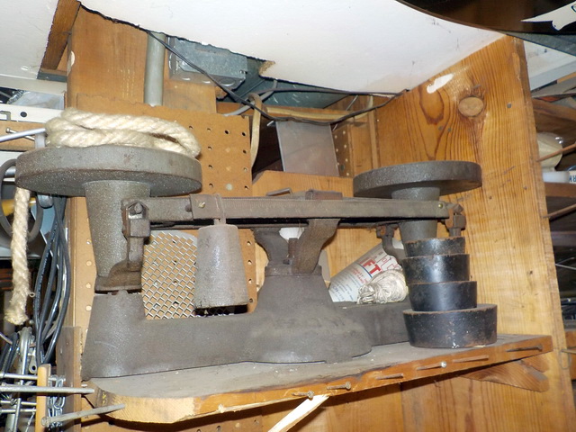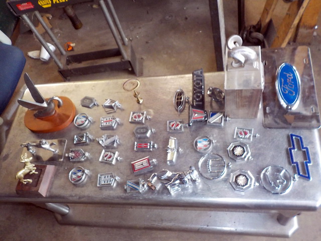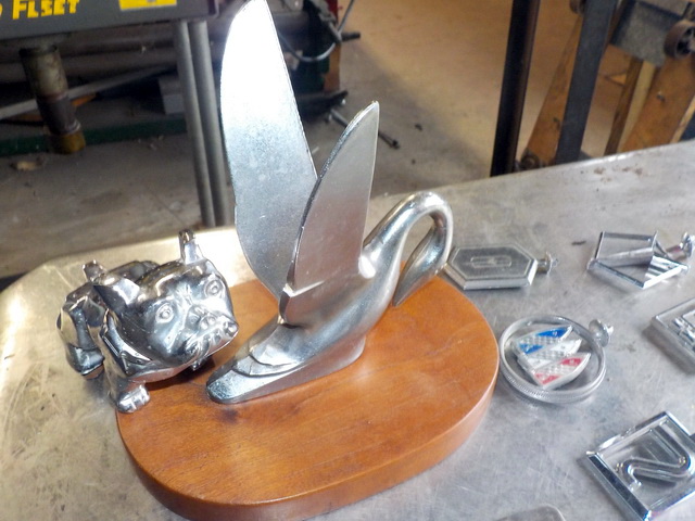 platform scale, collection of hood ornaments, hand shears, C-clamps, Vise-Grip