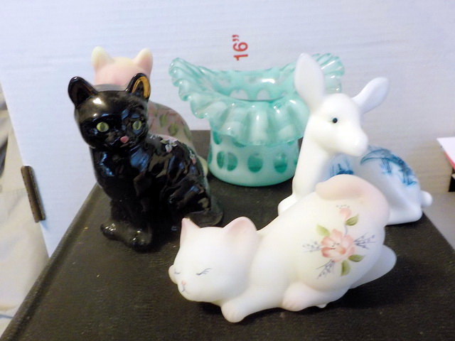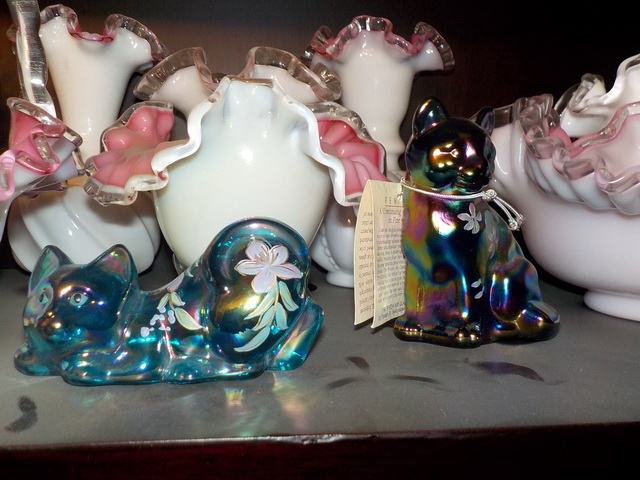 Fenton, (2) Fenton cats, green carnival glass vase, flow blue Mulberry plates &