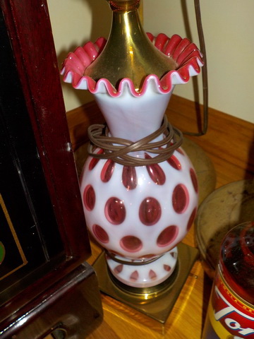 Opalescent Coin Dot table lamp – Red Carnival table lamp w/ prisms, hand painted