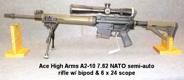 scope, Ace High Arms A2-10 7.62 NATO semi-auto rifle w/ bipod & 6 x 24 scope,
