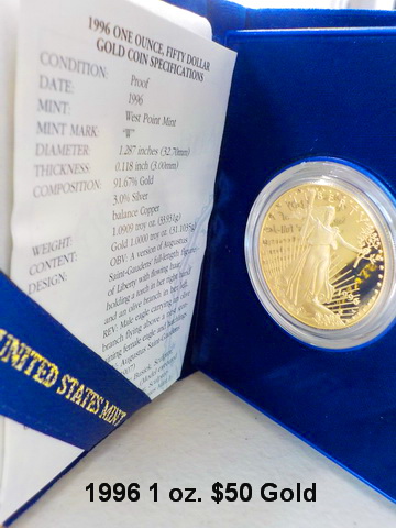 box & paperwork, 1996 1 oz. $50 proof Gold coin in box w/ paperwork, 1987