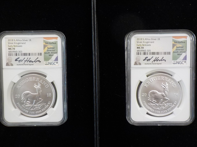 graded MS 70, (2) 2018 South Africa 1 oz. fine silver Krugerrand early releases