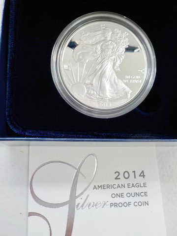 silver dollar, 2014 Amer. Eagle 1 oz. proof silver coin, (2) San Francisco Old