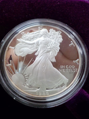 uncir. silver dollar set, 1986 American Eagle proof silver dollar in box no