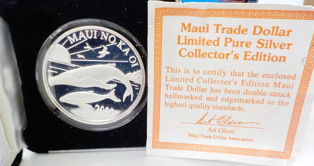 .999 fine silver trade dollar, 1982 Canadian silver dollar, 2004 colorized