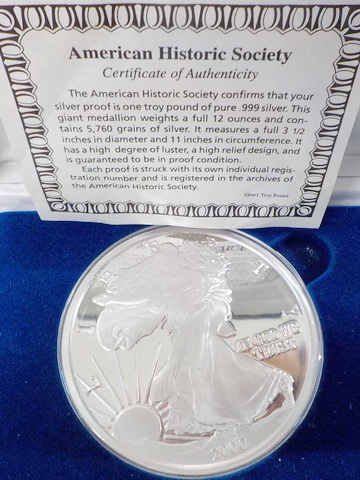 silver round, 2000 American Historic Society 12 oz. proof .999 silver round,