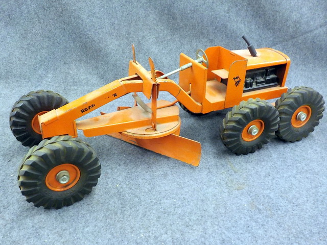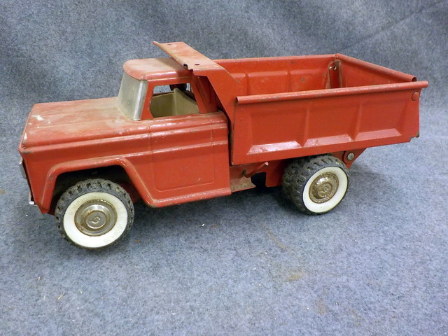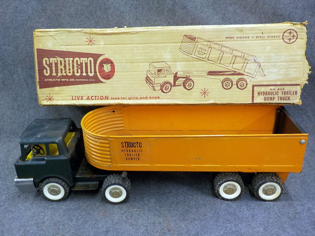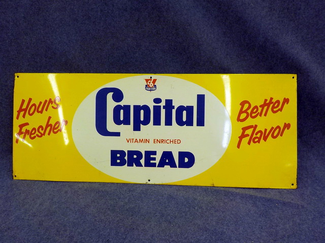 Bread” metal sign, vintage Lee metal tire sign, Structo hydraulic trailer dump