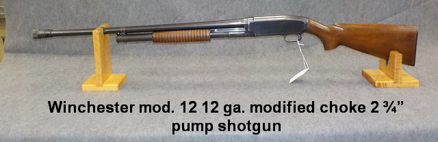 Higgins 4 x 32 scope, Winchester mod. 12 12 ga. modified choke 2 ¾” pump