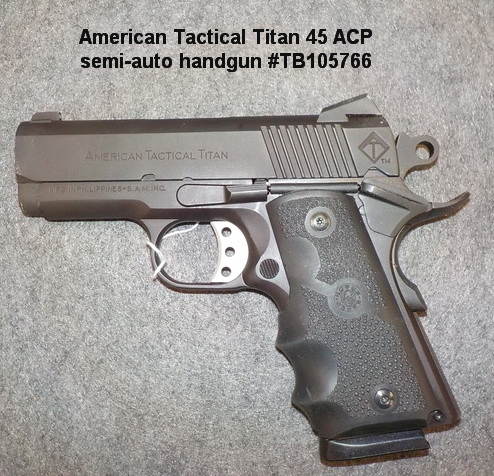 Titan 45 ACP semi-auto handgun #TB105766, Hatfield SAS 12 ga. 3” semi-auto
