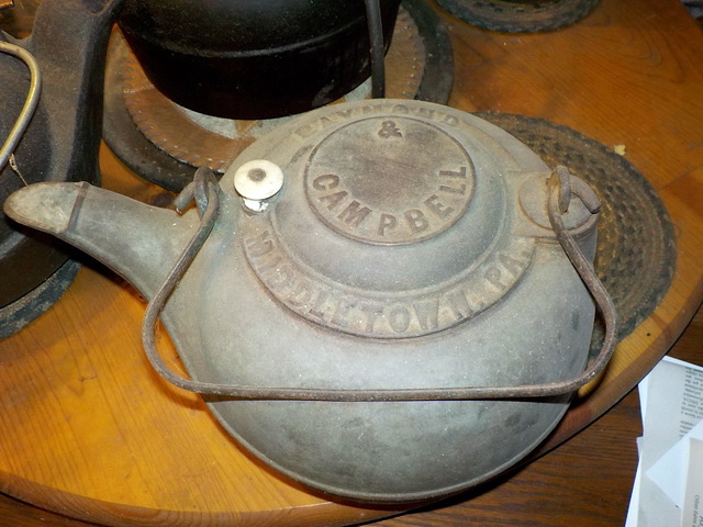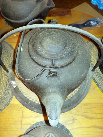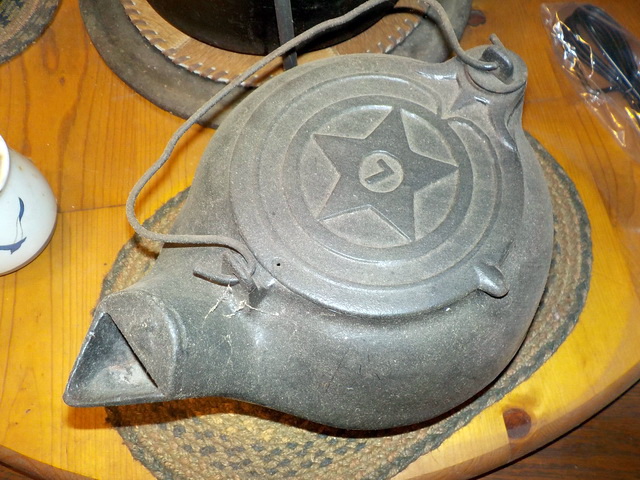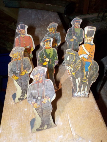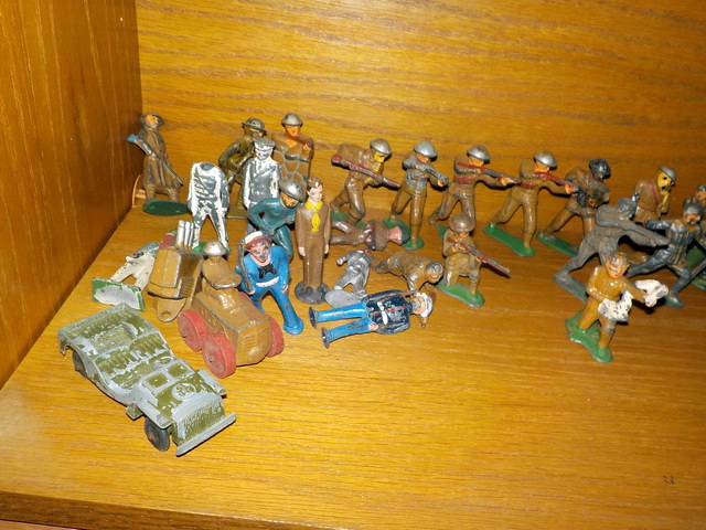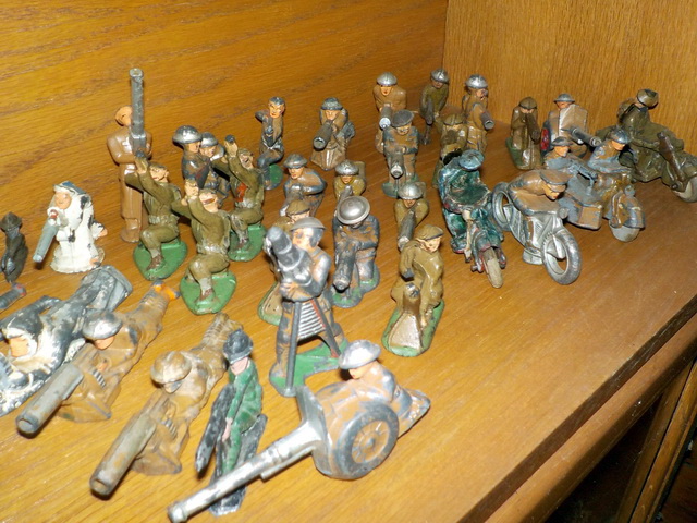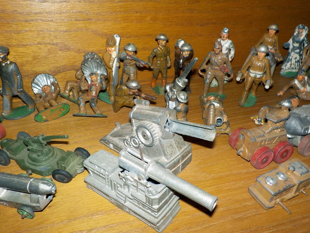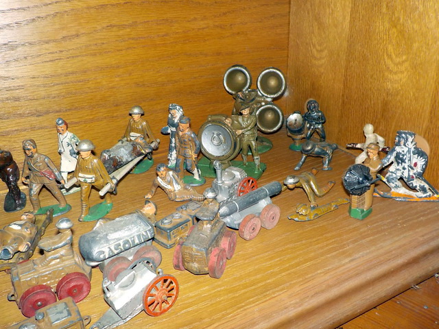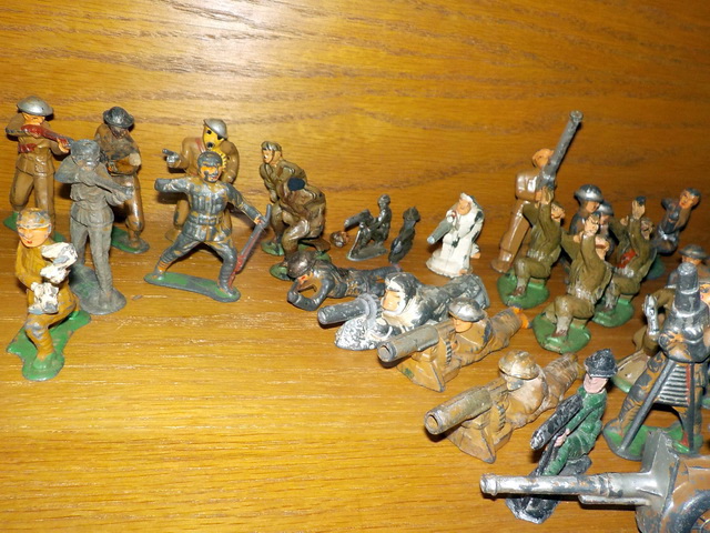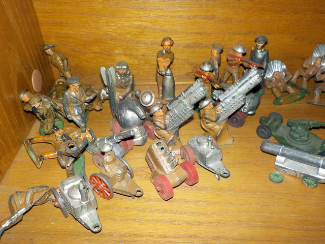 vintage World War I painted lead soldiers, old cast iron tea kettles, Griswold