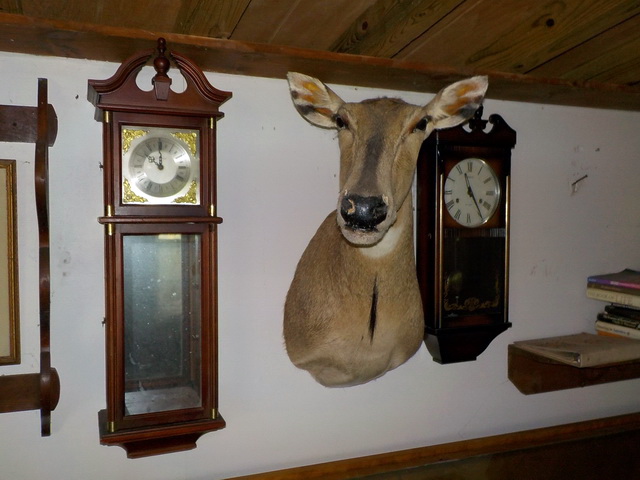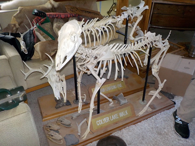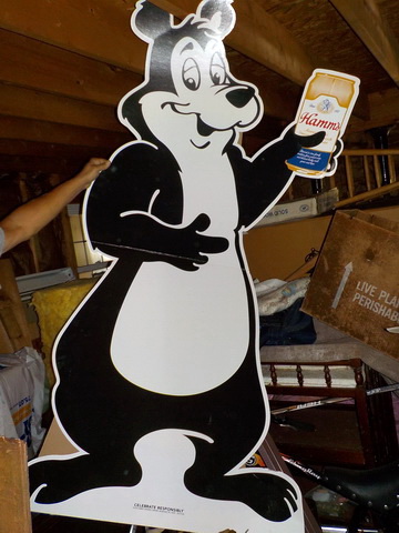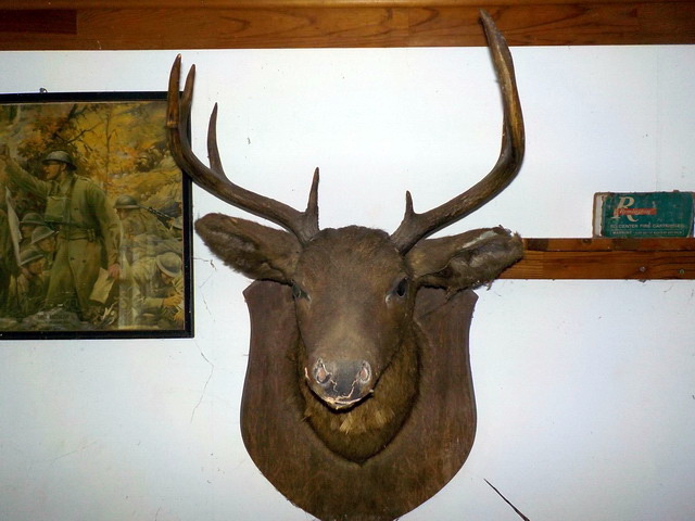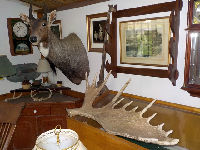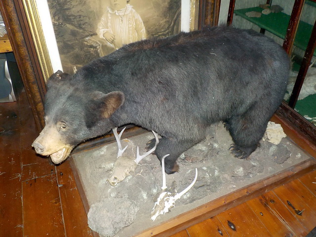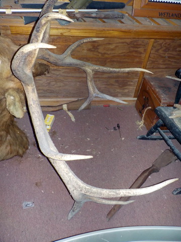 boxes, old full mount black bear, very large set of Elk antlers shoulder mounts,