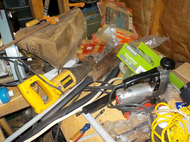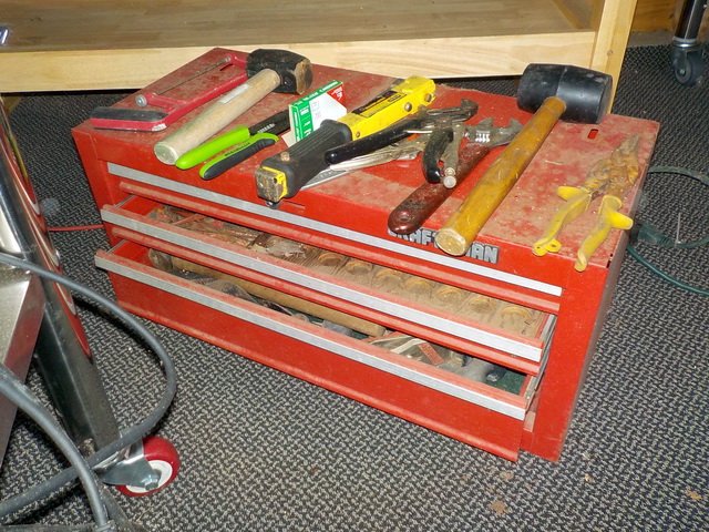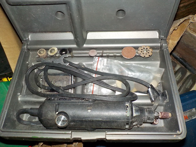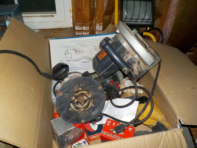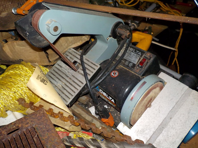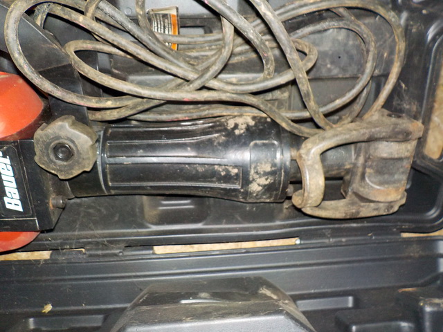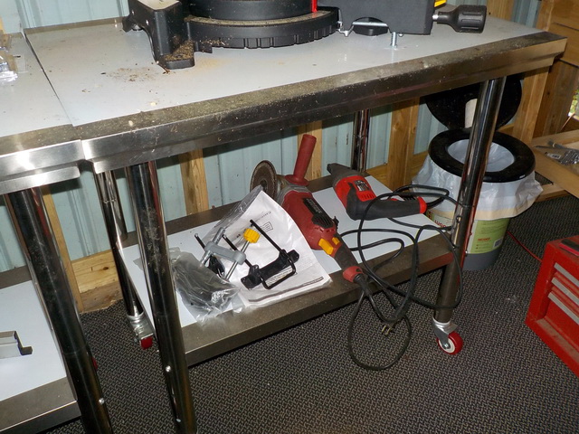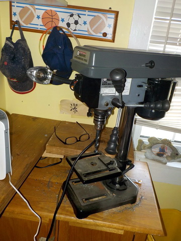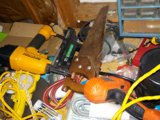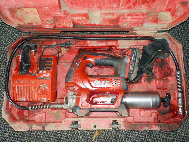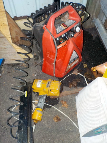 benchtop drill press, Milwaukee 18 volt grease gun, large Bostitch air nailer,