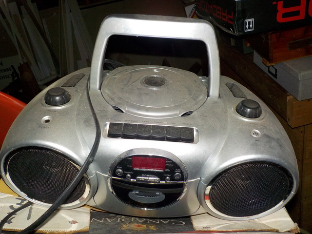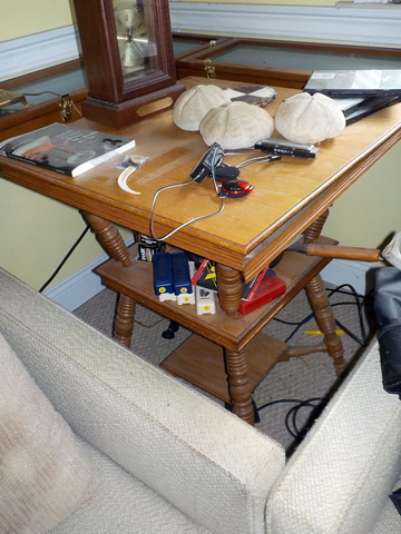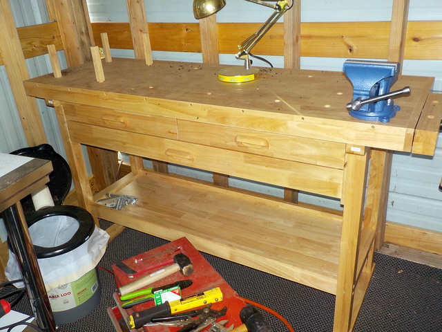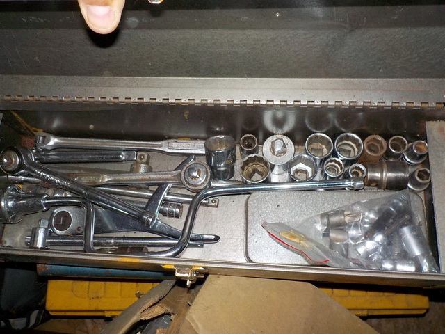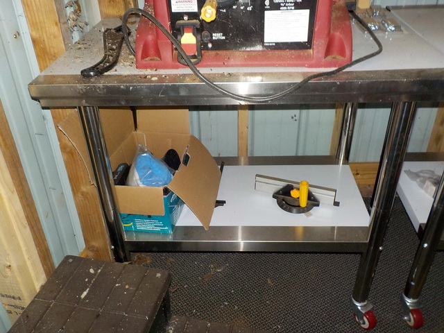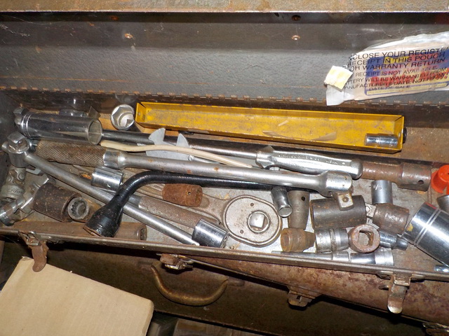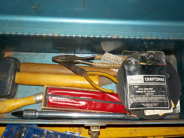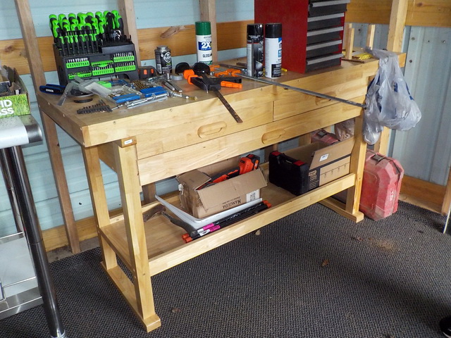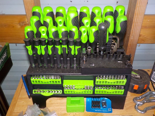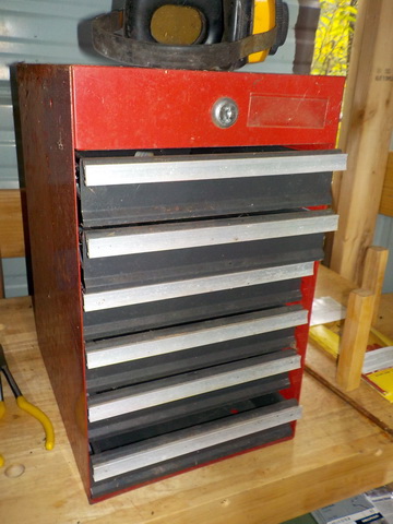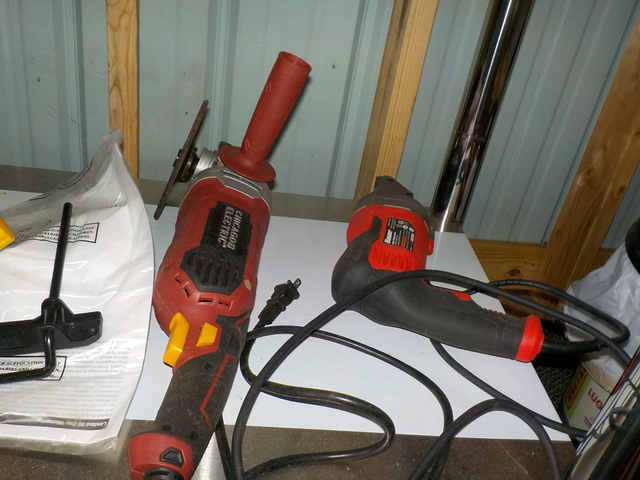 benchtop drill press, Milwaukee 18 volt grease gun, large Bostitch air nailer,