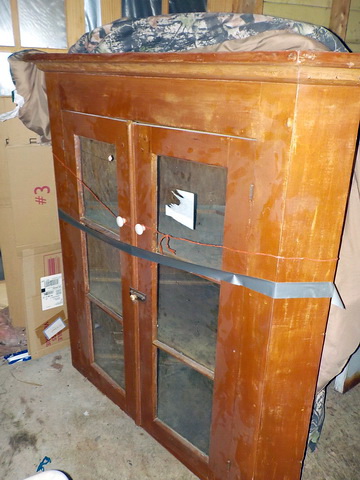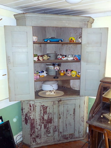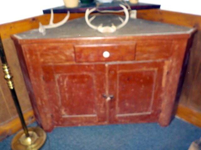 2 pc. corner cupboard w/ glass panes & red paint, antique blind door corner