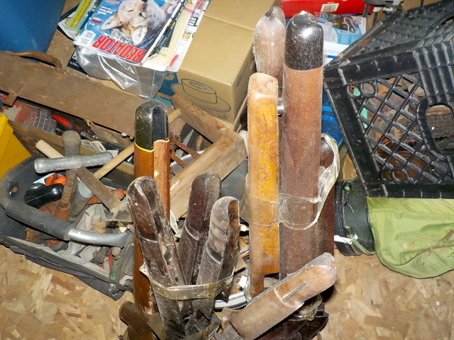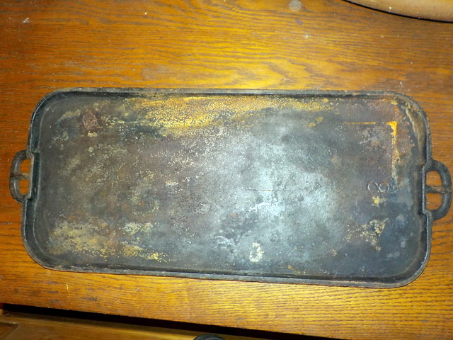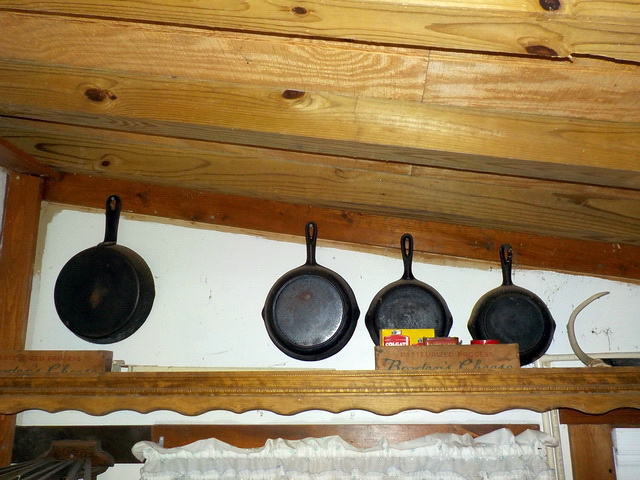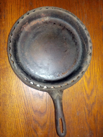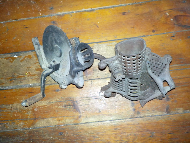 #11 griddle, other unmarked cast iron skillets, cast iron corn shellers, vintage