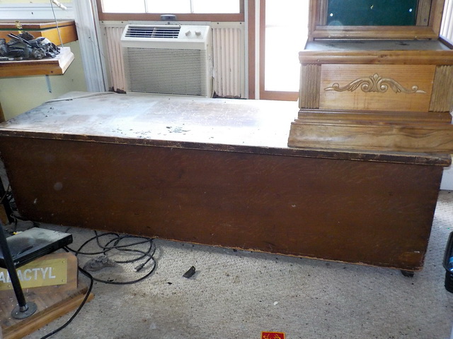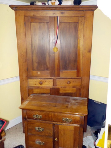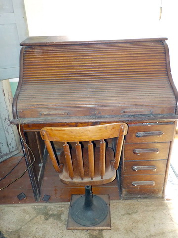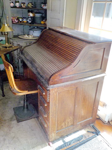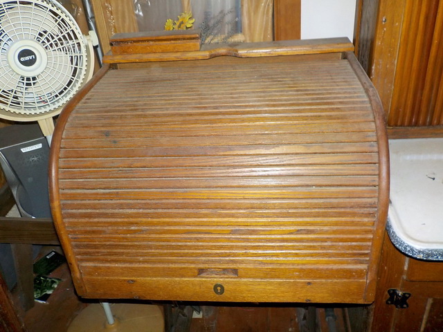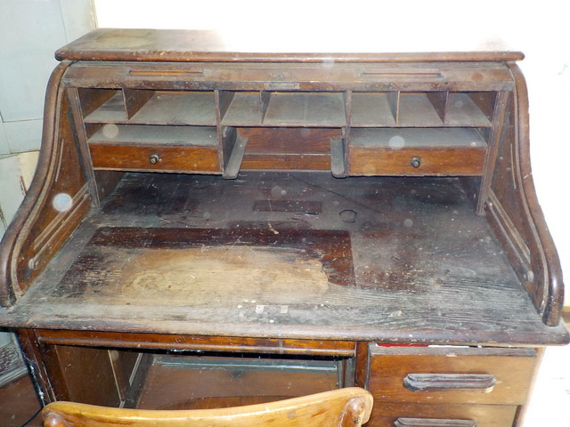 cupboard w/ old gray paint, cute size antique oak “S” rolltop desk w/ antique