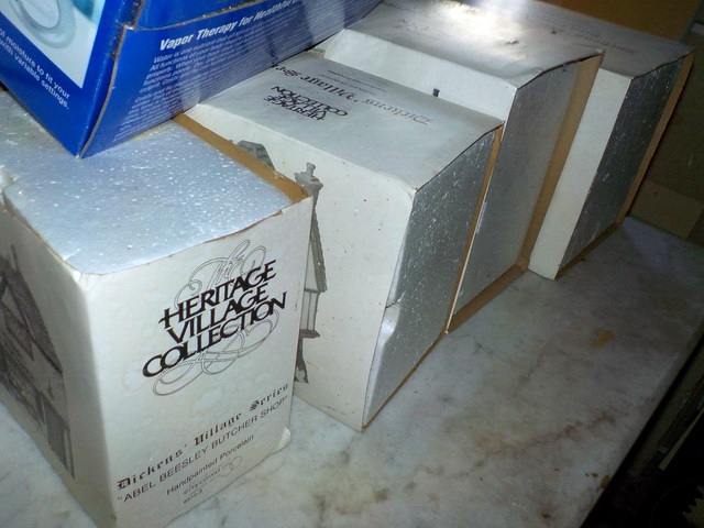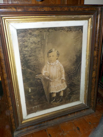 painting of young girl in beautiful ornate frame, Dickens’ Village houses in
