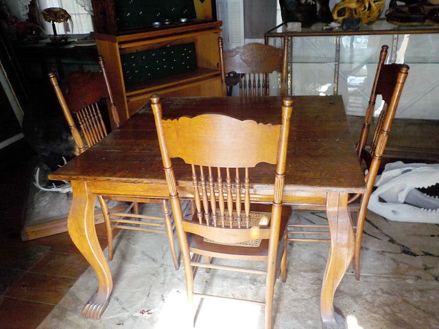 dining tables, antique oak press back chairs, antique oak hall seat, antique oak