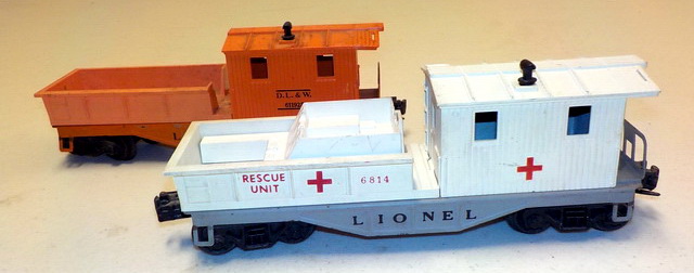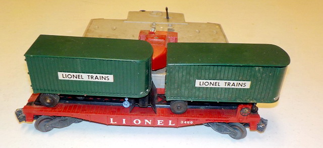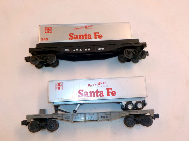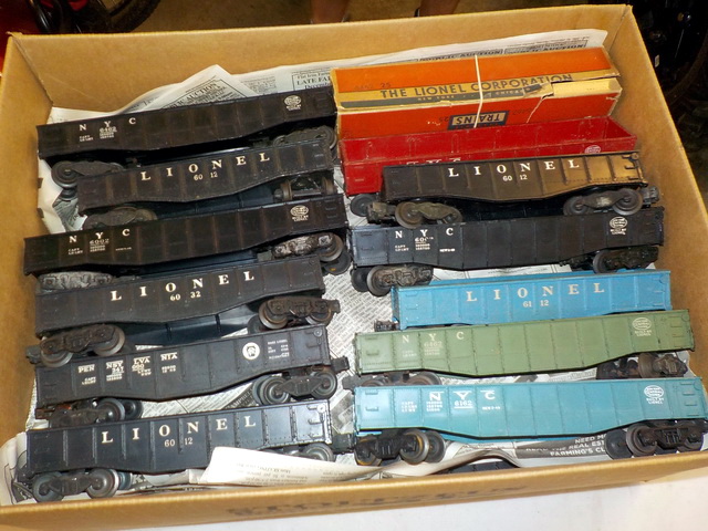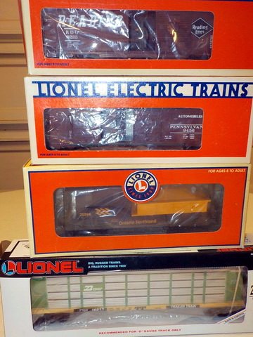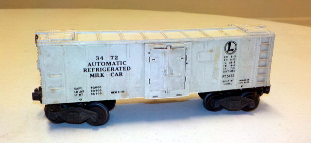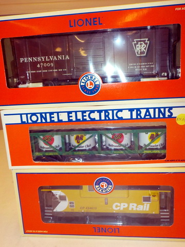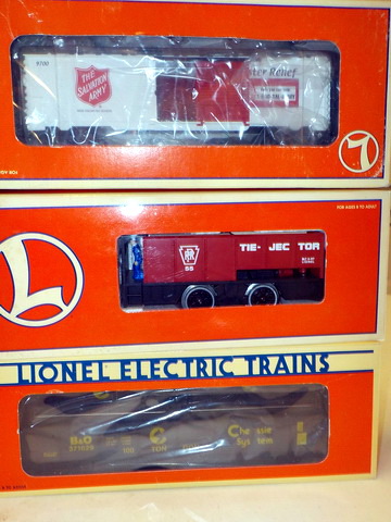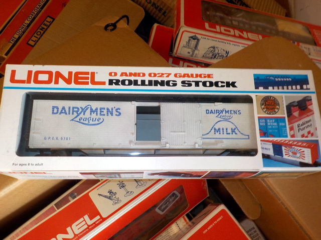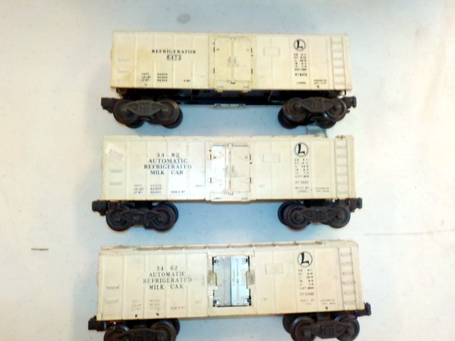 flatcar w/ pup Lionel Trains trailers, Lionel automatic refrigerated milk cars,