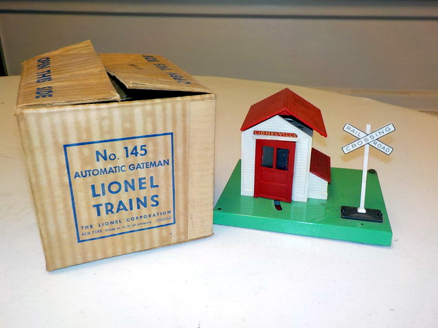 platforms, Lionel No. 145 automatic gateman in orig. box, Lionel #3656 operating