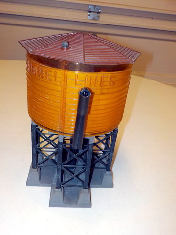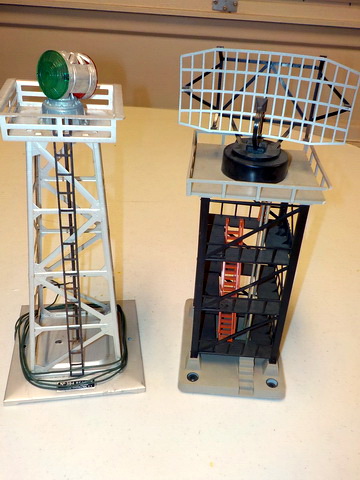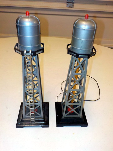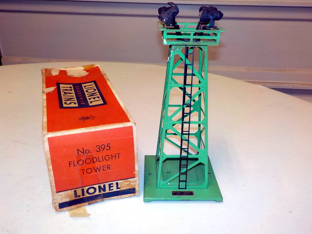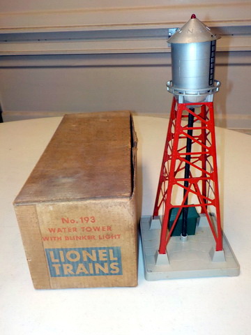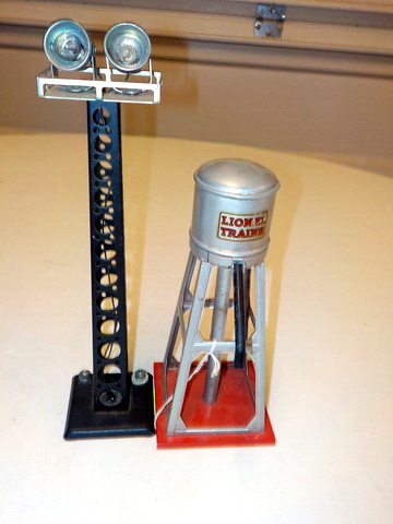 boxes, Lionel #193 water tower in orig. box, Lionel #395 flood light tower in