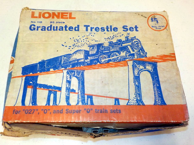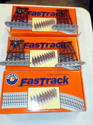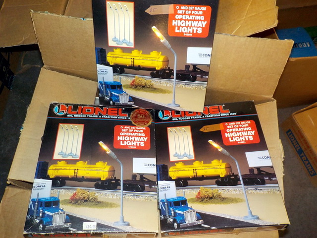 box, Lionel highway lights in orig. boxes, (3) Lionel 6-12038 elevated trestle