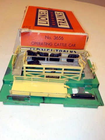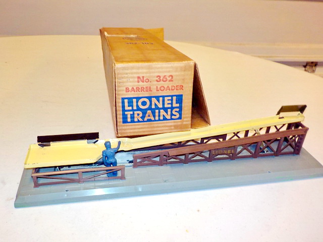 cattle car in orig. box, Lionel #362 barrel loader in orig. box, Lionel #125