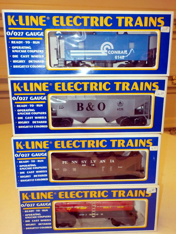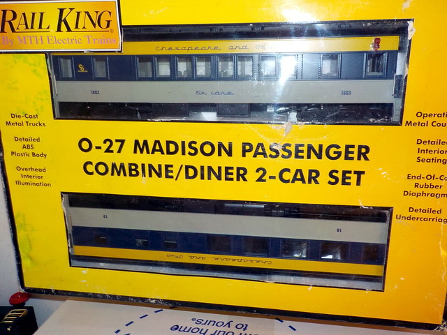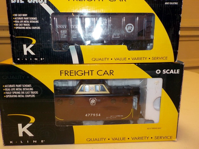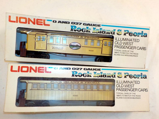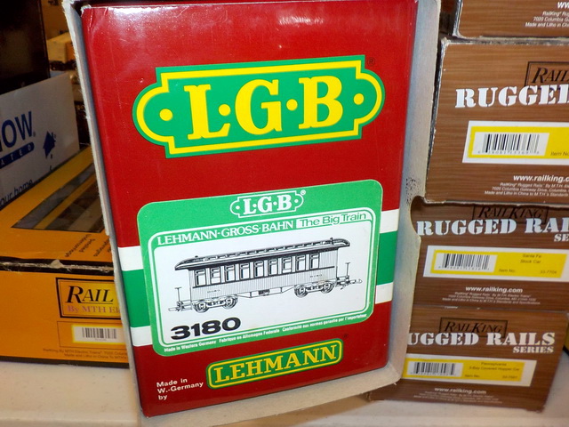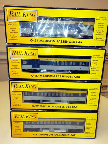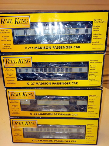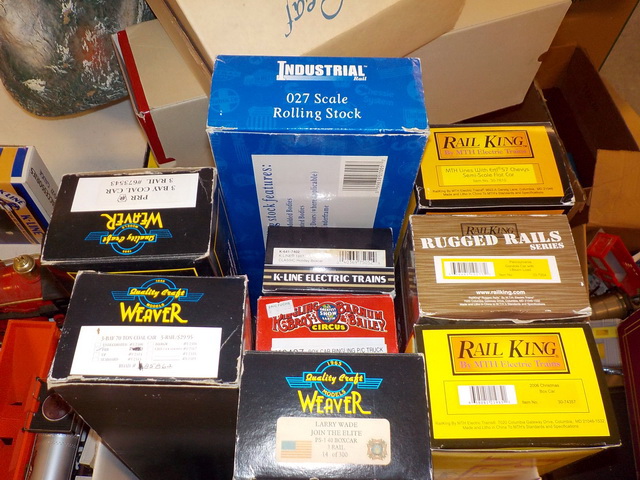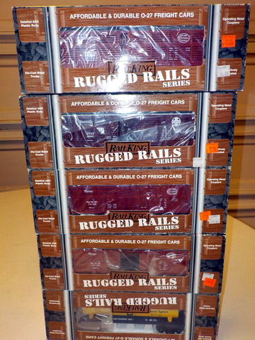 passenger cars in orig. boxes, (5) Rail King Rugged Rails boxcars in orig.