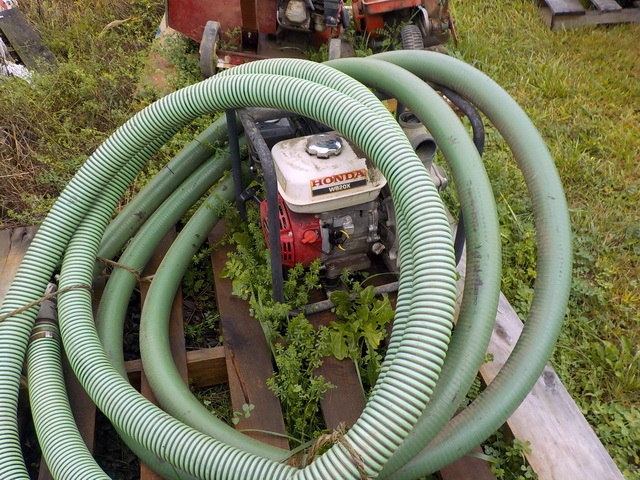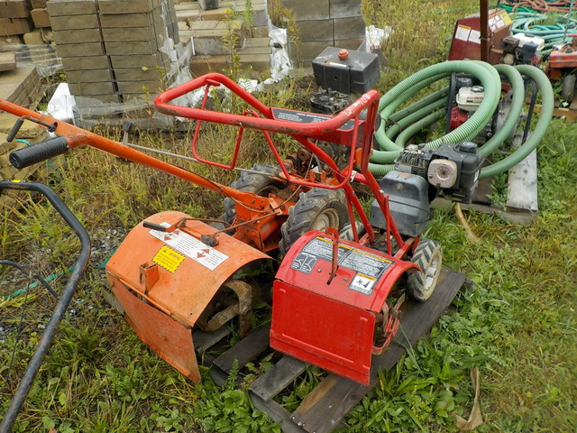 rake, Troybilt roto-tiller, Honda water pump w/ hose, New Holland Smoker drag