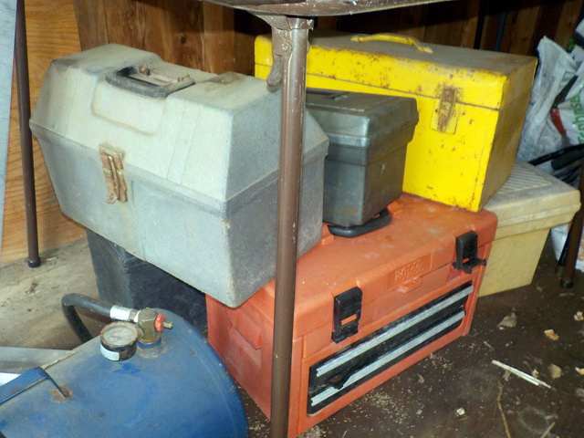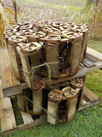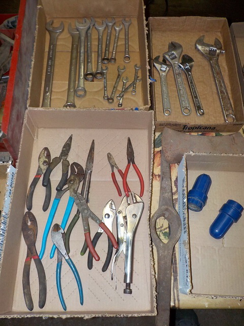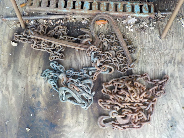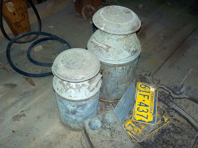 on cart, log chains, tool boxes, old cast iron bell, milk cans, hand Tools &
