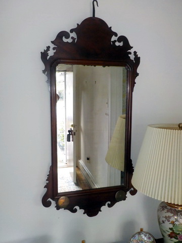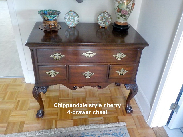 style cherry 4-drawer chest, Chippendale-style wall mirror, maroon leather