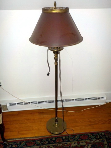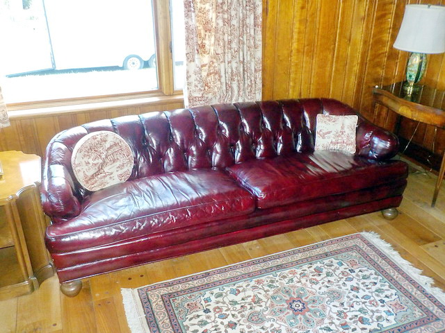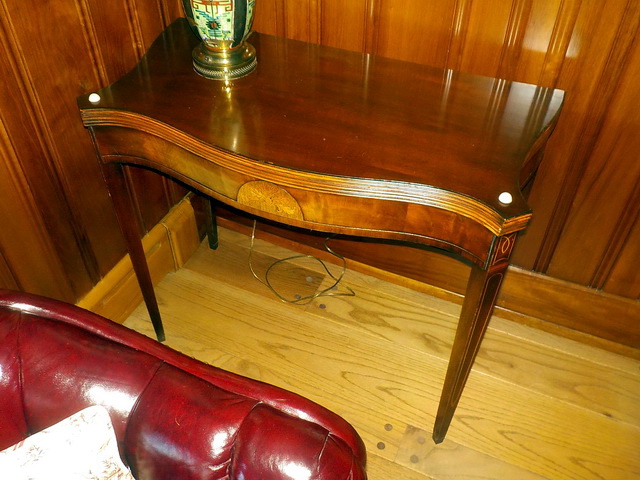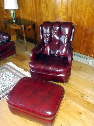 armchair w/ ottoman, maroon leather sofa, Hepplewhite-style game table,
