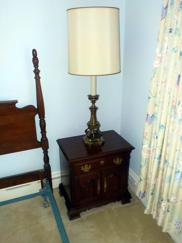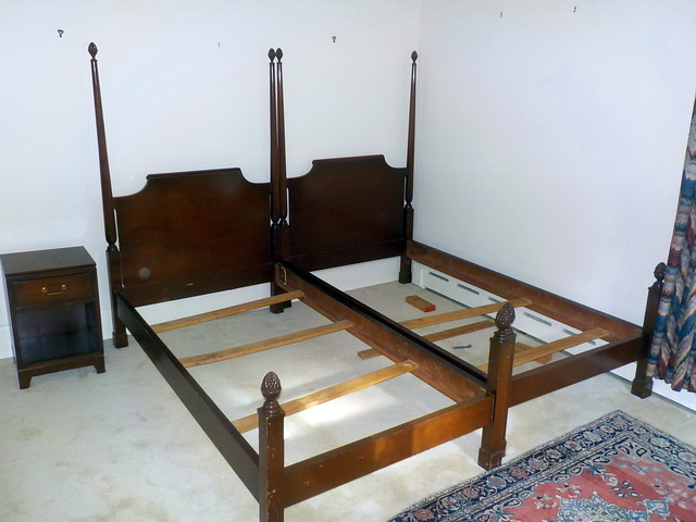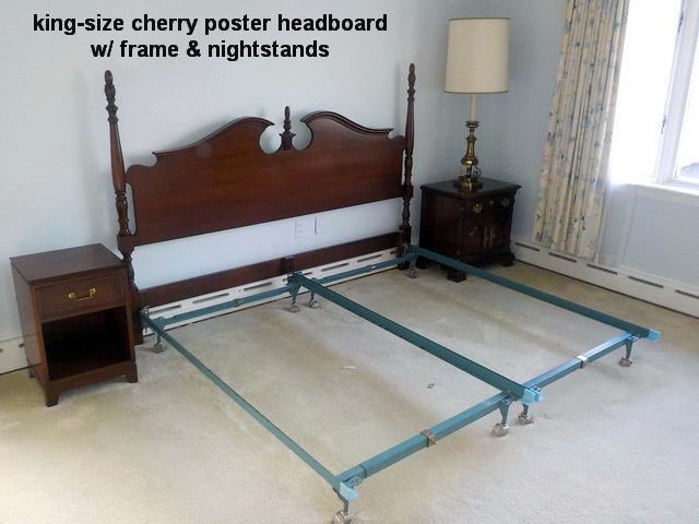 king-size cherry poster headboard w/ frame & nightstands, pr. pineapple twin