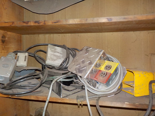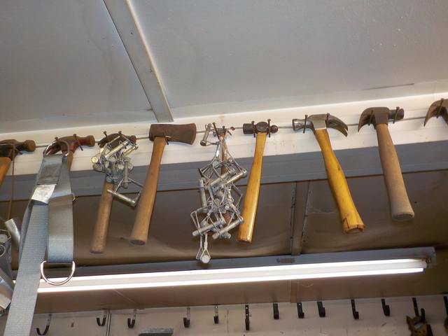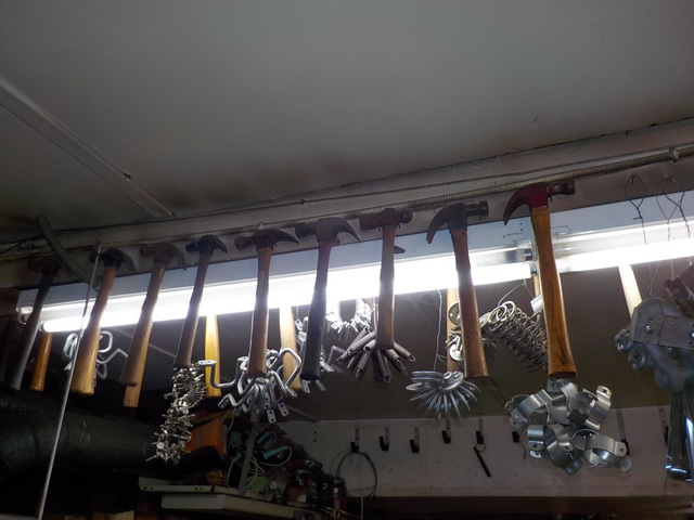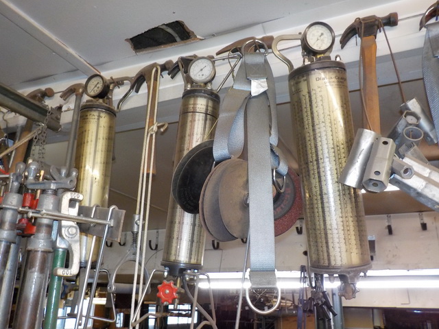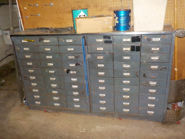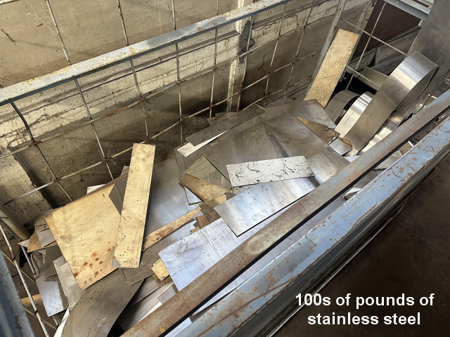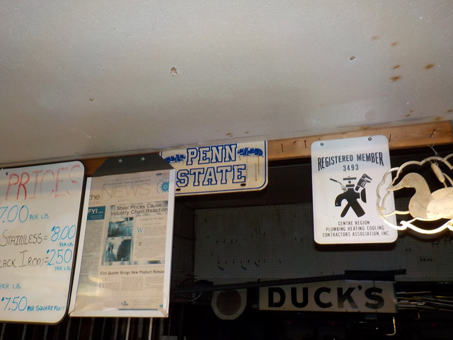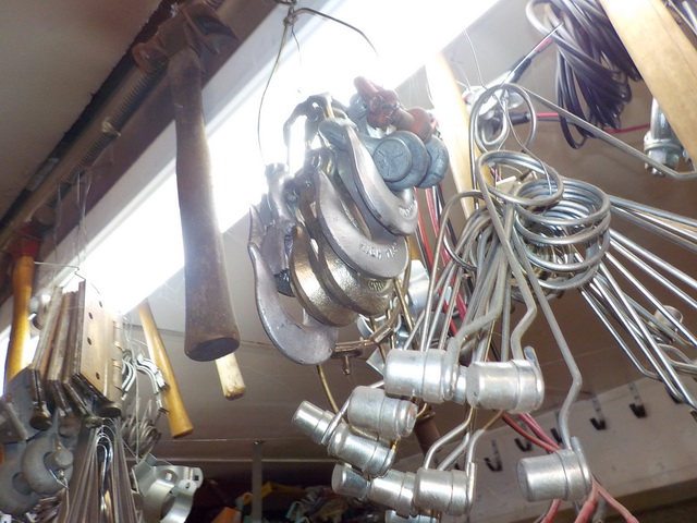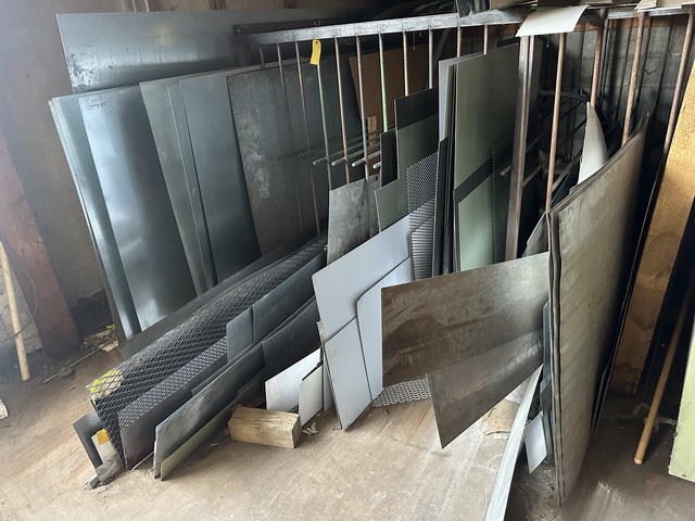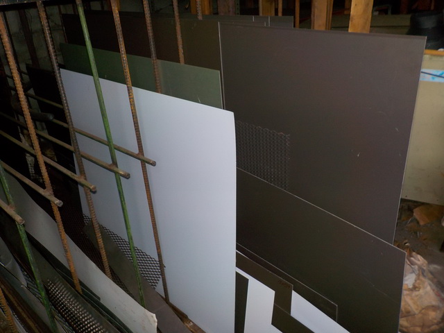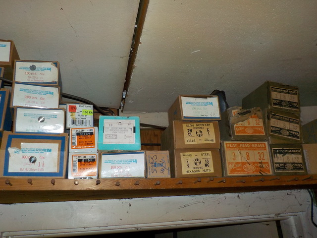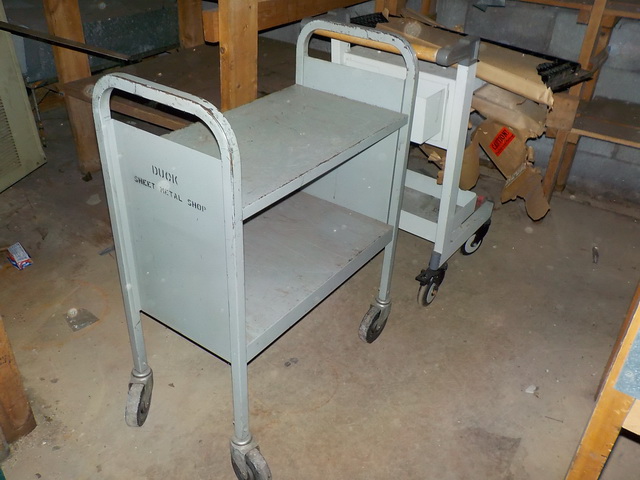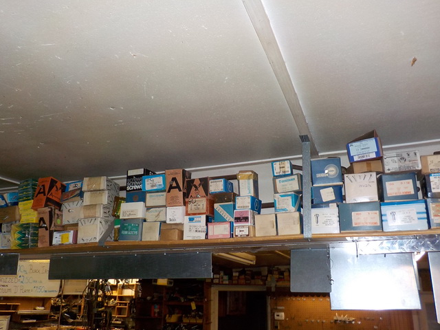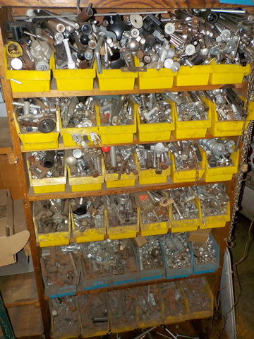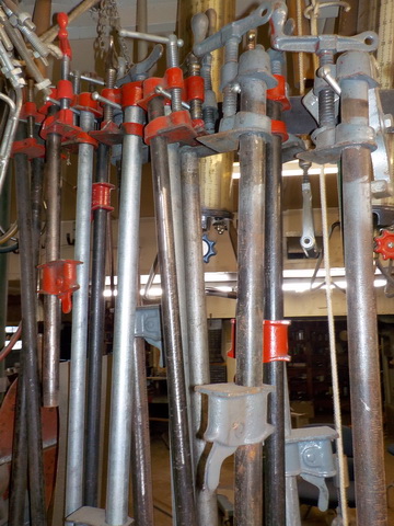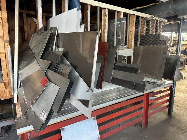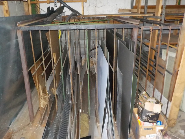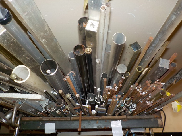 of sheet metal, copper rain spout, pipe glue clamps, bolt bins, sheet metal shop