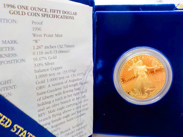 box & paperwork, 1996 1 oz. $50 proof Gold coin in box w/ paperwork, 1987