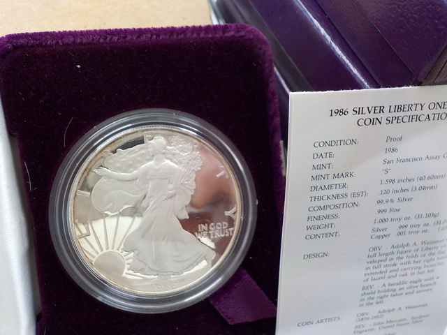 uncir. silver dollar set, 1986 American Eagle proof silver dollar in box no