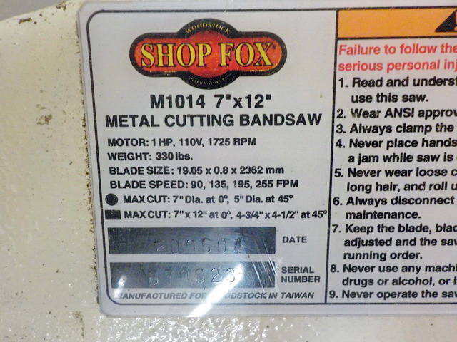 grease pump, Shop Fox M1014 7” x 12” metal cutting bandsaw, Shop Fox W1702 fl.