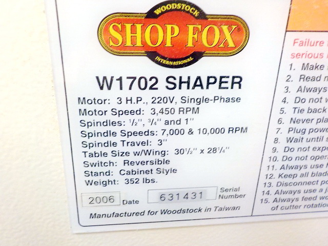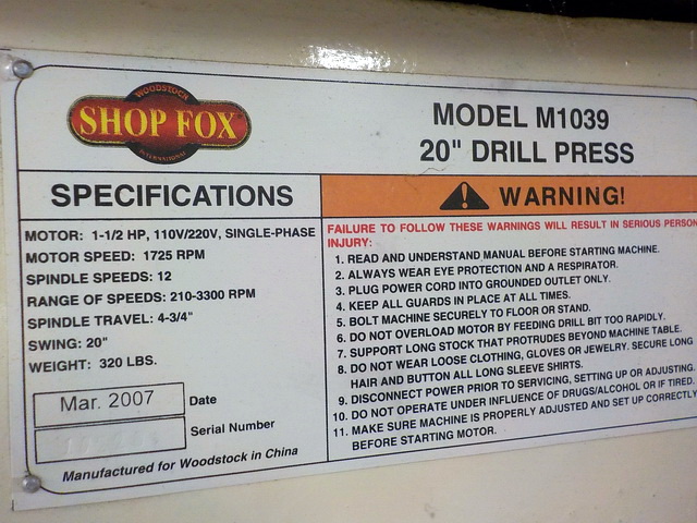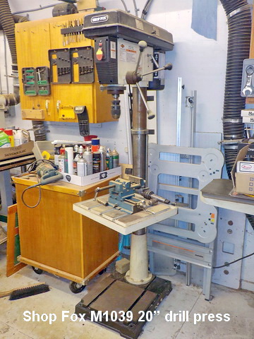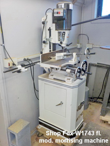 W1743 fl. mod. mortising machine, Shop Fox M1039 20” drill press, Shop Fox