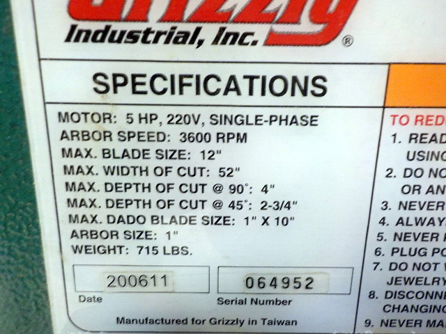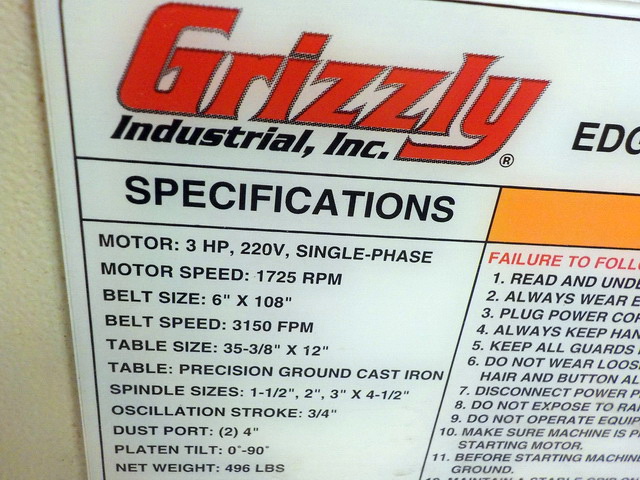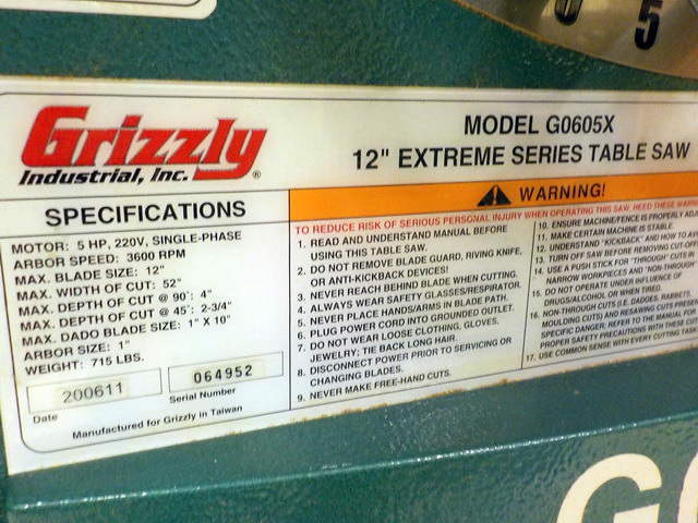 spindle sander, Grizzly Extreme Series G0605X 12” table saw w/ extension table,