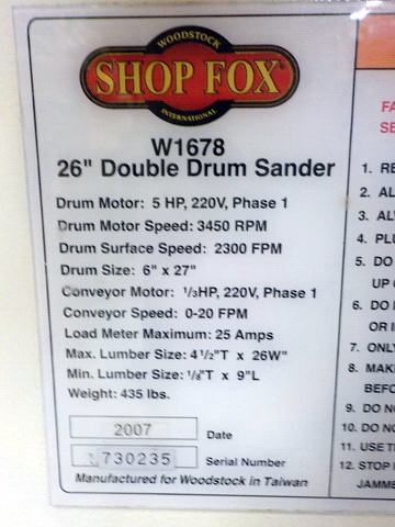 mod. shaper, Shop Fox W1678 26” double drum sander w/ mobile base, Shop Fox