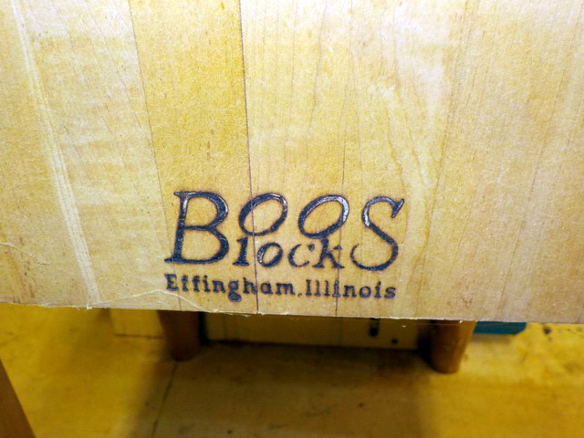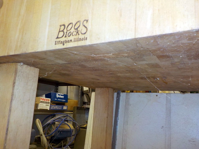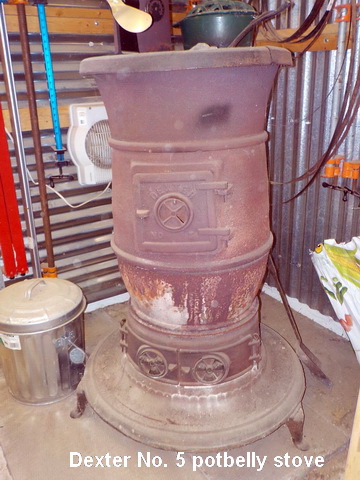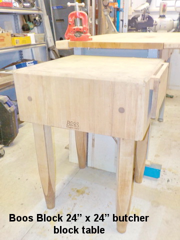 Block 24” x 24” butcher block table, Dexter No. 5 potbelly stove, antique stick
