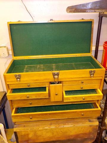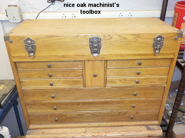 vise, nice oak machinist’s toolbox, 8” vise on stand, Wellsaw, (2) Kobalt floor
