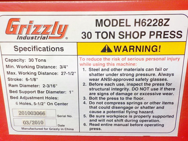 collector, Grizzly H62287 30-ton shop press, Grizzly G0596 8” Industrial bench