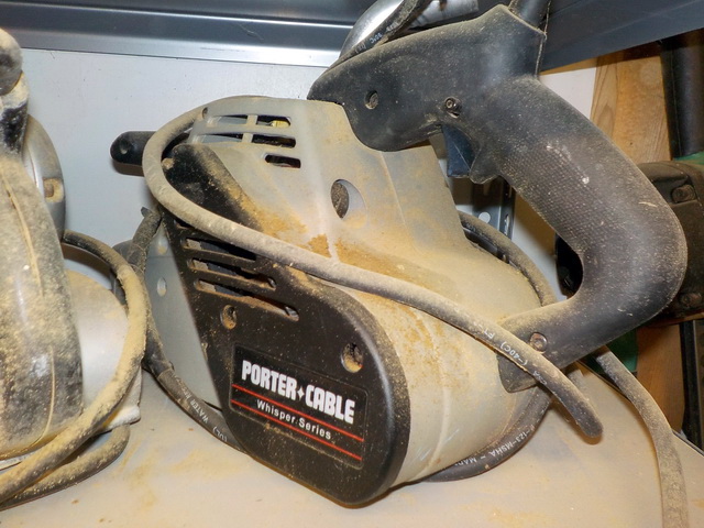 bench-top compound miter saw, Stanley 16” drum sander w/ power feeder,